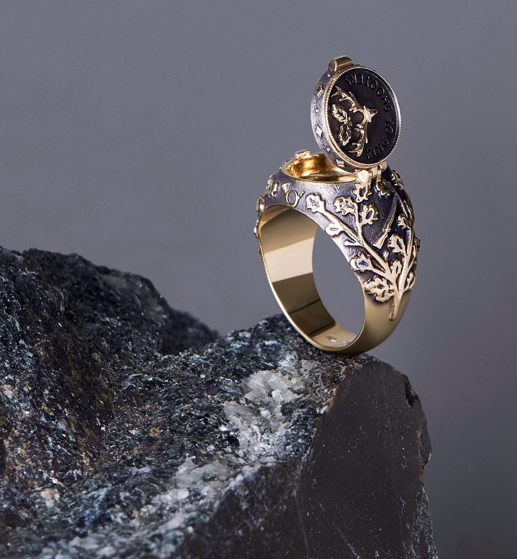 Перстень "Охотничья История" - знак высшей награды. В секретном отделении можно хранить памятную часть добытого трофея или немного пороха на удачу. На крышке изображена эмблема клуба. Ветви дуба полностью обвивают перстень, между листьями и жёлудями прячется фазан, на которого нацелено ружьё охотника